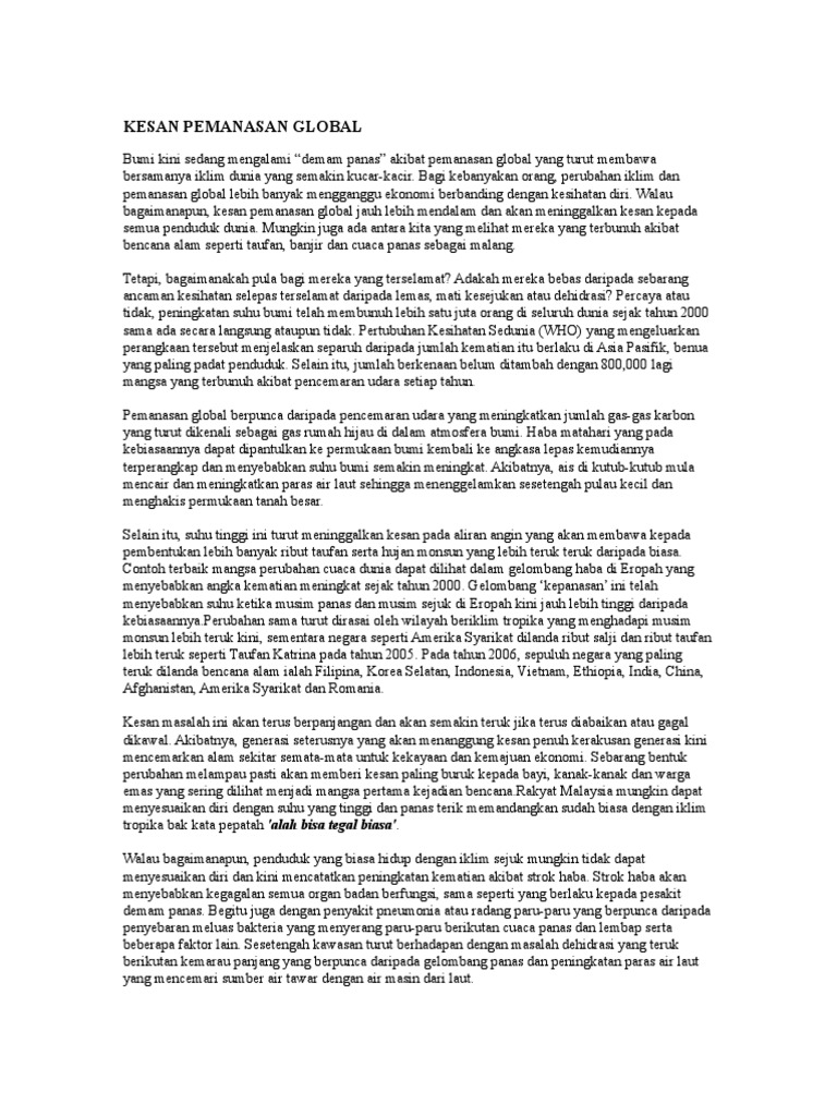 Kesan Pemanasan Global Contoh Karangan Bahasa Melayu Pdf